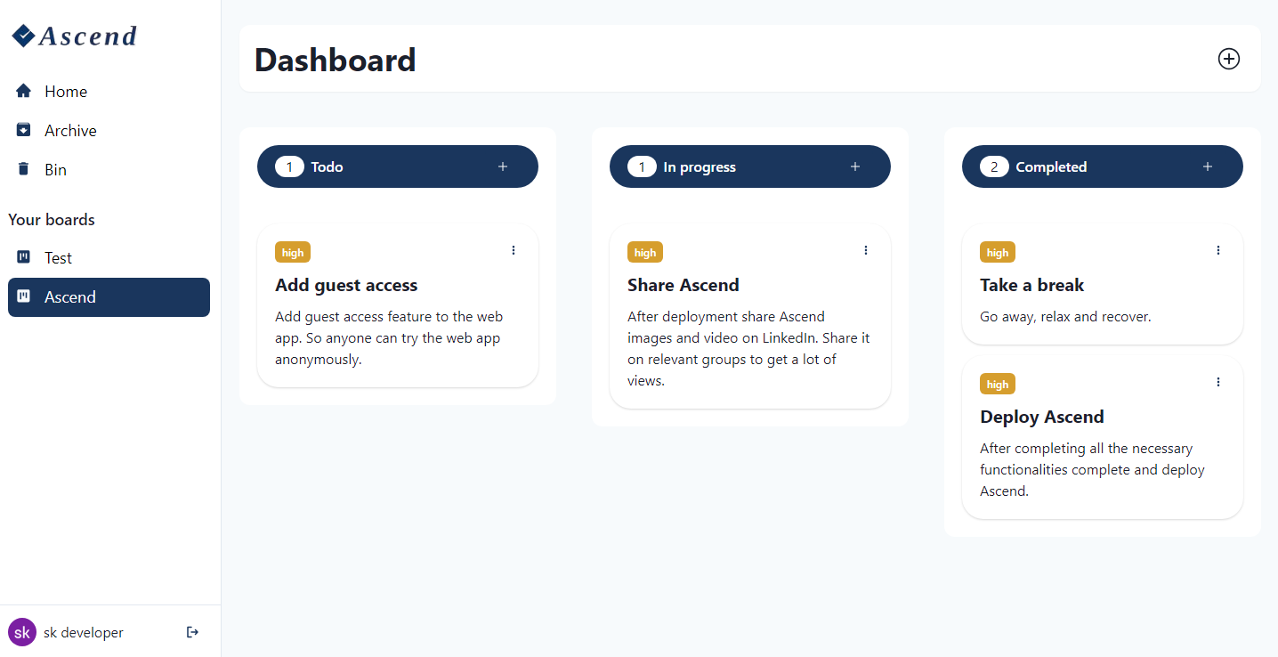 A Kanban web app, inspired by Trello, designed for seamless project management. Create, archive, and restore boards effortlessly. Manage tasks with intuitive drag-and-drop functionality, allowing smooth transitions and reordering within lists. Built with React.js, Firebase, Chakra UI, and React Router DOM, our app ensures a sleek user experience. Sign in securely with a magic link sent to your email or via Google authentication.